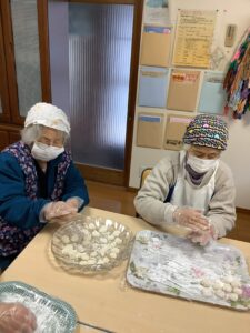 出来立てのお餅は利用者さんと近所の方とで丸めてぜんざい・きな粉・砂糖醤油味で
