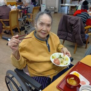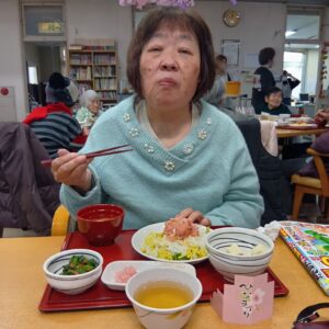 美味しそうにちらし寿司を頬張る利用者さん。