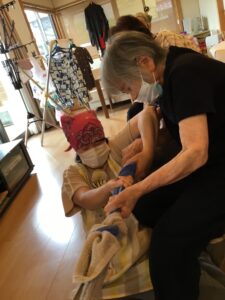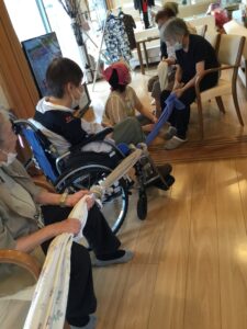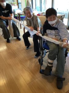 タオルをつないで綱引き対決も行い チームで協力して戦う事が出来ました。