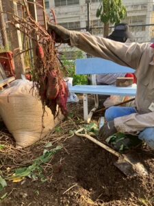 ワクワクしながら大量のツルを刈り上げ(ものすご~く重たかったです)、スコップや手を使って傷をつけないように掘り進めると紫色のきれいなさつまいもが姿をあらわしました。予想通りたくさんとれました!!
