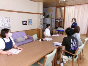 世の中には先ほどまで元気だった方が急変されてしまい命を落とされるケースがあります。施設でも毎日の状態観察を欠かさず行っていても間に合わないこともあります。そういった急変時・緊急時に慌てずに対応できることが施設でも求められ、1分1秒争うときにどの職員でも対応ができるように学ばせて頂きました。1人でも多くの方に安心して生活が送れるように精進して参ります。