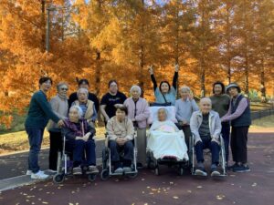 今回の紅葉見物ドライブは、しょうちゃんの家のご利用者全員、9名で出かけています。車内でも楽しいお話で盛り上がりました。
