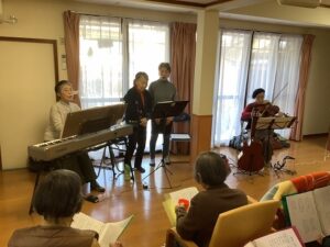 舞鶴のボランティアでは最高齢(ご本人が言われていました。)とのことでしたが、演奏も歌もとても素晴らしく「あんな高音出ないわ。」と地域の方も利用者さんも言われ感動されていました。